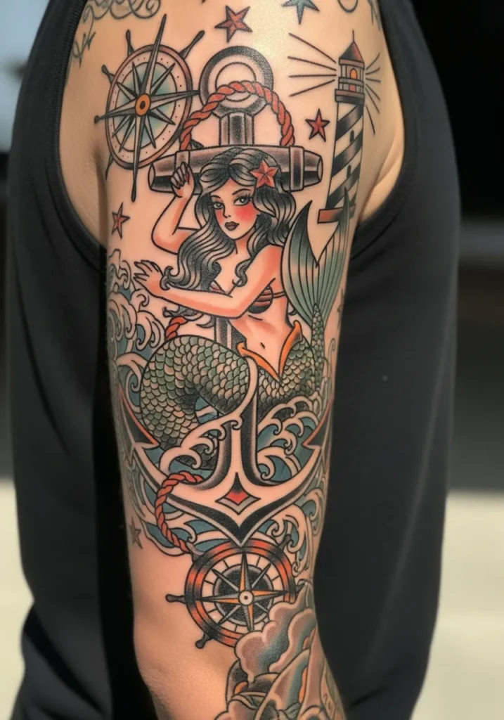 This tattoo sleeve is pure nautical fantasy. A stunning mermaid sits beside an anchor, her shimmering green tail curling through ocean waves while a striped lighthouse and compass complete the scene. The color palette of teal, coral, and gold ties everything together beautifully, while bold outlines keep it unmistakably traditional. The sleeve wraps the arm like a sea story frozen in time.
