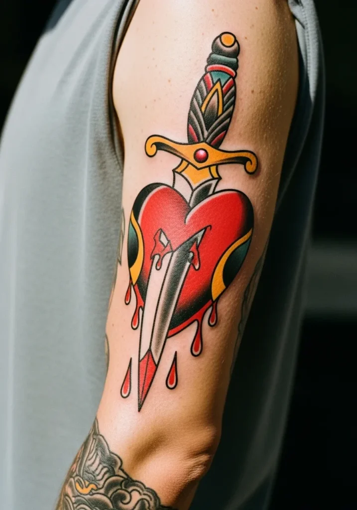 This striking upper arm tattoo shows a dagger piercing through a bleeding red heart, surrounded by touches of yellow and black that make the colors stand out beautifully. The bold outlines and solid fills give it that unmistakable American Traditional punch, while the placement makes it an instant eye-catcher.