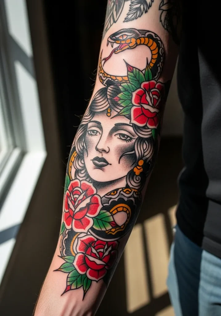 This forearm tattoo features a stunning woman s face framed by red roses and a curling snake. The artist used black and gray shading for her portrait, while the flowers and snake pop in vivid red, green, and orange tones. It s perfectly placed to follow the arm s natural shape, making the design flow elegantly from wrist to elbow.