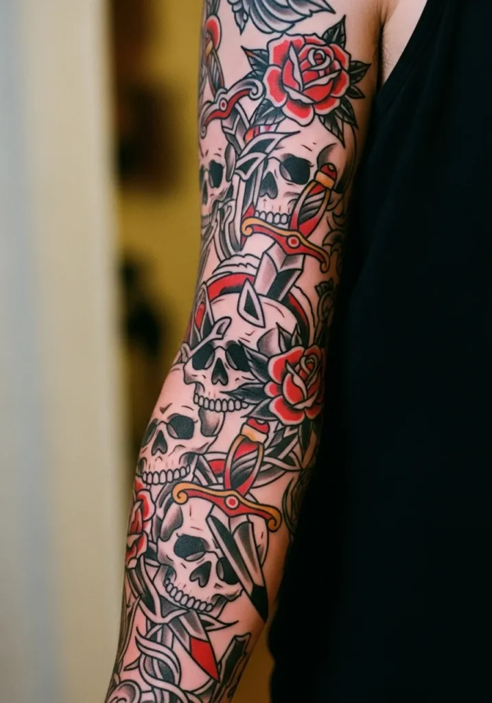 This sleeve is a classic American Traditional masterpiece filled with skulls, red roses, and gleaming daggers. The bold black outlines and vibrant reds and yellows make every element pop, giving the design that timeless tattoo-shop feel. The layout flows naturally down the arm, with each skull and rose perfectly spaced to create balance and rhythm. It s dark, striking, and full of old-school personality.