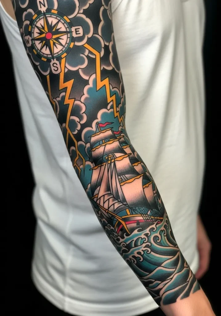 This full sleeve captures a storm at sea with breathtaking detail. A classic sailing ship battles massive waves under dark clouds, framed by lightning bolts and a golden compass above. The navy blues, golds, and whites blend perfectly, and the composition flows down the arm like a moving scene. It s traditional tattoo art at its finest.