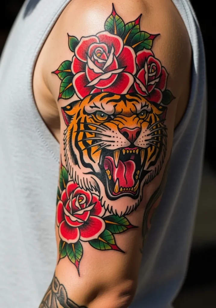 This upper arm tattoo combines fiery energy with timeless beauty. A snarling tiger sits surrounded by bold red roses, its orange and black stripes glowing against the skin. The placement perfectly follows the shoulder, creating a balanced and dramatic look that screams classic tattoo art.