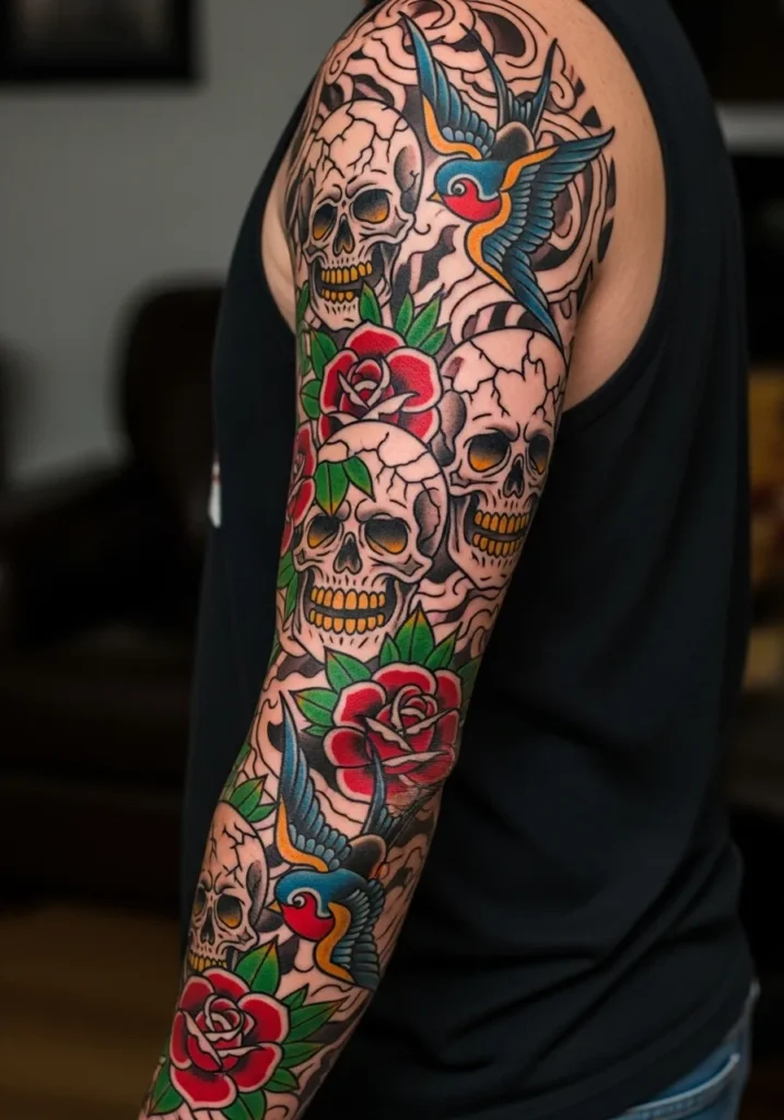 This full sleeve combines all the most iconic old-school motifs skulls, red roses, and blue swallows. The layout is busy in the best way, with every inch of skin filled with vivid color and crisp linework. The yellow accents in the skulls and the green leaves balance the deep reds, making it look cohesive and bold from shoulder to wrist.