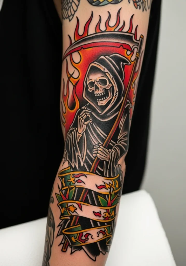 This fiery Grim Reaper tattoo brings the drama in all the right ways. The skeletal figure holds a scythe outlined in deep black, framed by red-orange flames that make the piece feel alive. The rich shading and bright banner at the bottom balance out the dark theme beautifully. It fits perfectly along the arm, flowing naturally with the body s shape.