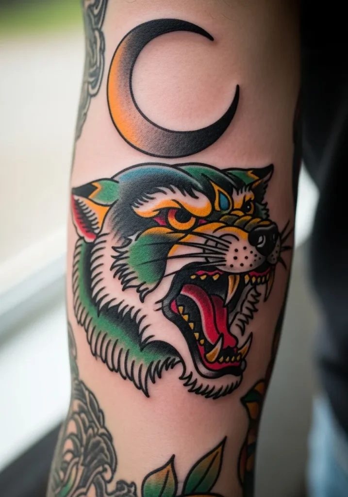 This upper arm tattoo features a fierce wolf mid-snarl, framed by a crescent moon above. The deep greens, fiery oranges, and jet blacks give the design that unmistakable American Traditional punch. Every whisker and tooth feels alive, and the bold moon shape creates a beautiful contrast against the wild expression of the wolf.