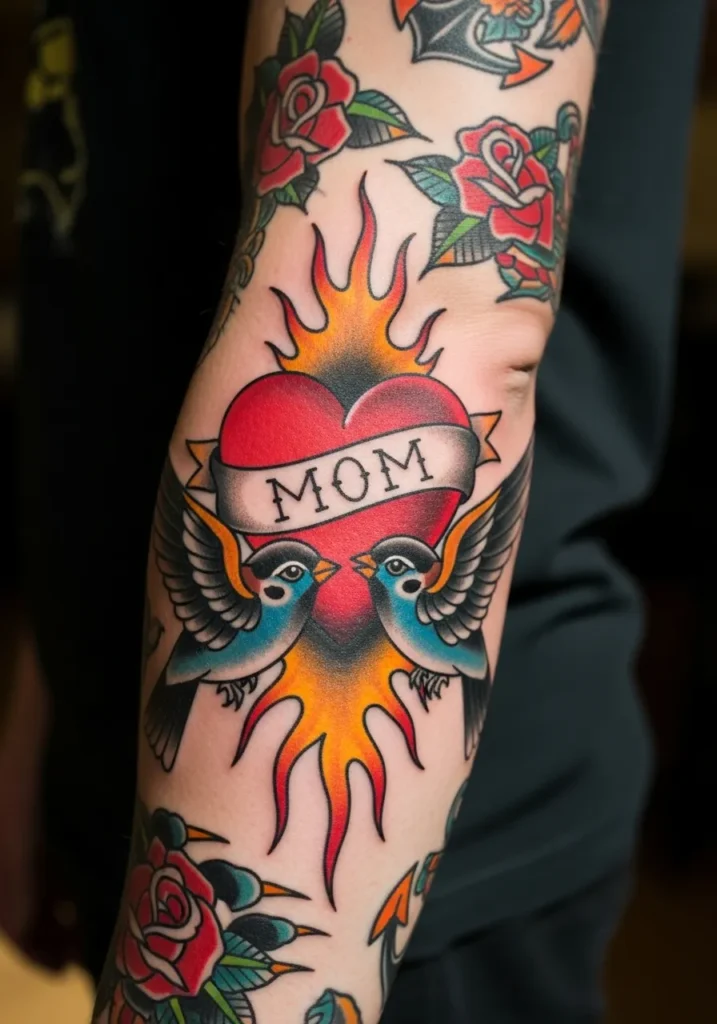 Right on the arm, this heart and swallows tattoo glows with warmth and nostalgia. The bright red heart framed by golden flames feels alive, and the MOM banner adds that timeless touch of love. The two blue swallows mirror each other perfectly, symbolizing loyalty and protection. Surrounded by classic red roses, the whole piece feels like a heartfelt throwback to the golden era of tattooing.