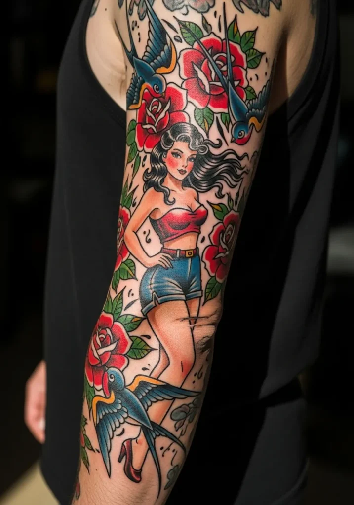 This tattoo sleeve brings classic Americana to life with a confident pin-up girl surrounded by roses and swallows. The bright reds, blues, and greens radiate with that nostalgic vintage energy. Her pose is playful and bold, framed perfectly by lively details that fill the arm without feeling cluttered. It s a showstopper from every angle.