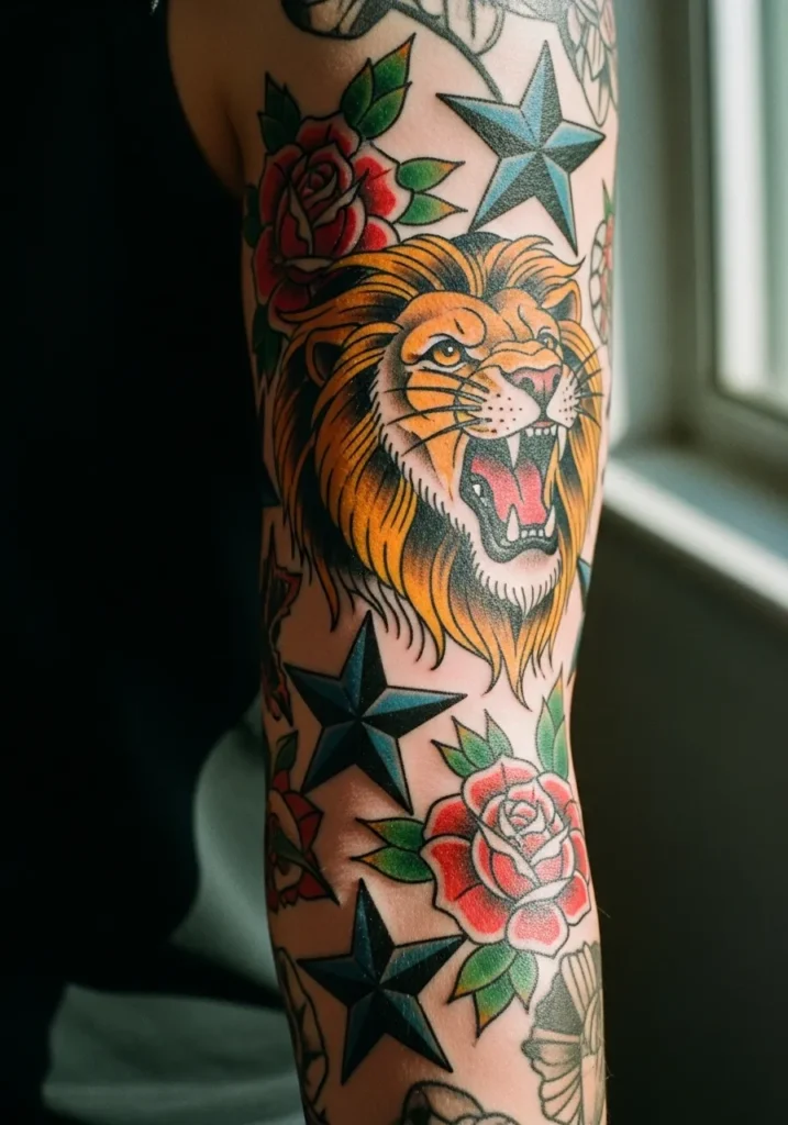 This bold arm tattoo features a roaring lion surrounded by red roses and navy stars. The golden mane is rich and vibrant, glowing against the crisp black outlines and deep green leaves. The stars add a classic touch of Americana, while the placement keeps everything balanced and visually strong. It s the kind of tattoo that immediately catches attention.