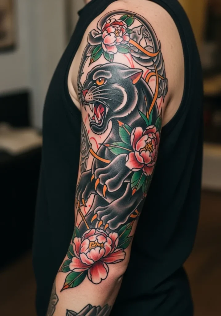 A roaring black panther prowls through a field of blooming pink peonies in this striking arm tattoo. The deep blacks, lush greens, and soft reds create the perfect balance of ferocity and grace. The crisp outlines and bold shading make the design pop, while the placement down the upper arm emphasizes the power in the panther s stance.