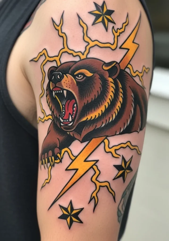 This bold bear tattoo on the upper arm is pure power. The bear snarls fiercely, framed by jagged yellow lightning bolts and star motifs that give it a dramatic edge. The mix of rich browns, golds, and blacks keeps it classic, while the simple background lets the energy of the bear take center stage.