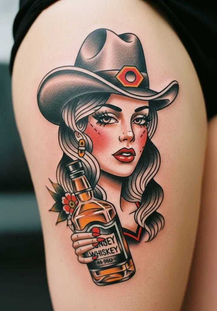 This stunning American Traditional portrait is placed perfectly on the upper thigh, giving it a classic pin-up appeal. It features a gorgeous cowgirl wearing a stylish grey hat, her long, flowing hair framing a face with dramatic makeup and those signature high-contrast features. She s holding a bottle of Whiskey that has a warm, amber glow, with a small flower detail near the bottle base. The colors are kept rich and sultry, with plenty of blush-red on her cheeks and lips, classic yellow-gold for the whiskey, and dark outlines that make every detail pop with an old-school charm.
