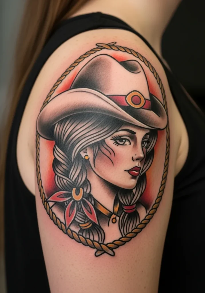 This shoulder tattoo features a beautifully framed portrait of a cowgirl with braided hair and a wide-brimmed hat. Surrounded by a rope border, the design blends warm shades of red, gold, and black that bring out the vintage American traditional feel. The soft shading adds depth, while her confident gaze gives the piece a powerful personality.