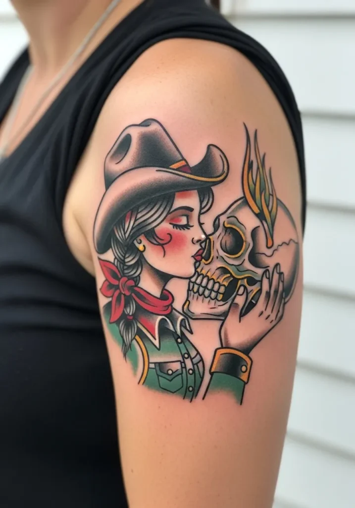 This upper arm tattoo tells a story full of mystery and emotion. A cowgirl in a red scarf and brown hat tenderly kisses a skull framed in muted gold and green tones. The shading work is flawless, and the contrast between life and death gives it an almost cinematic look.