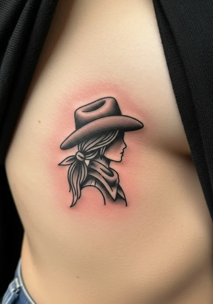 This small ribcage tattoo captures a simple yet captivating side profile of a cowgirl, complete with a wide hat and a tied bandana. The soft black shading and clean outlines give it a subtle elegance that feels timeless. The minimal design paired with gentle pink tones around the tattoo makes it look fresh and perfectly placed.