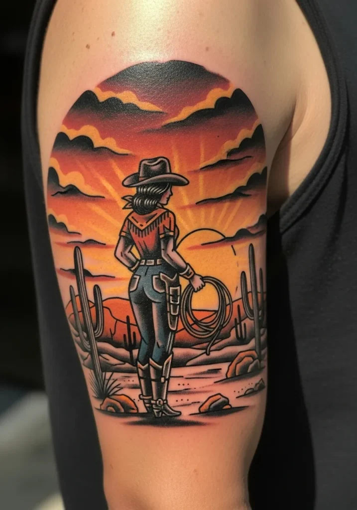 Talk about a statement piece! This tattoo covers a good portion of the upper arm and shoulder, depicting a cowgirl standing in a dramatic desert landscape in a classic American Traditional style. She s seen from behind, wearing a western shirt, tight jeans, and boots, holding a coiled lasso as she gazes out at an incredible sunset. The colors are what truly make this design sing deep oranges, fiery reds, and golden yellows bleed together in the sky, framed by the dark silhouettes of the cactus and rugged terrain, all brought together by those bold black outlines typical of the style.