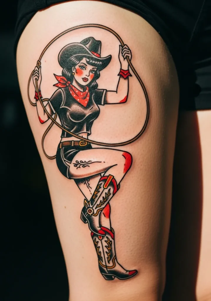 This bold thigh tattoo features a classic cowgirl in black shorts, a red bandana, and a wide-brimmed hat, holding a lasso mid-swing. The strong outlines, warm reds, and deep blacks bring that unmistakable American traditional charm. The shading adds beautiful depth, especially around her boots and hair, giving the design a vintage Western poster vibe.