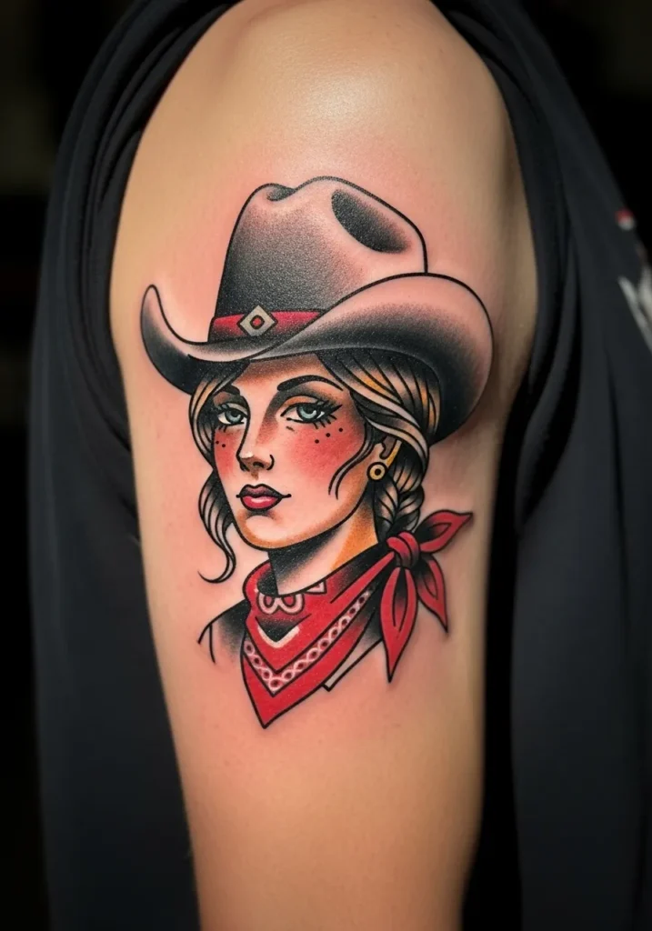 This gorgeous tattoo is a traditional American style portrait gracing the upper arm, sized perfectly to take center stage. It features a striking cowgirl rocking a grey wide-brimmed hat with a diamond detail, her blonde hair peeking out from beneath. She has bright, soulful eyes and a vibrant red bandana knotted around her neck, which really pops against her fair skin. The solid black outlines and shading on the hat give it a wonderful depth, while the clean lines and bold primary colors especially the red make this piece instantly recognizable as a classic American traditional design.