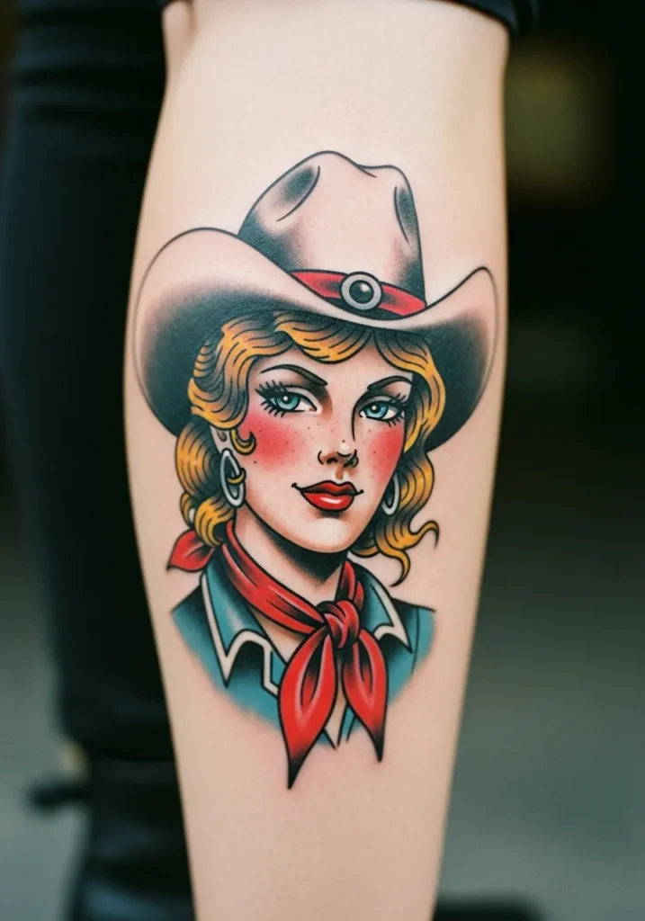 This tattoo features a close-up of a cowgirl s face with curly hair, blue eyes, and a crisp white hat. The red scarf and rosy cheeks add just the right amount of warmth. The clean lines and rich colors make it a perfect example of traditional Americana art.