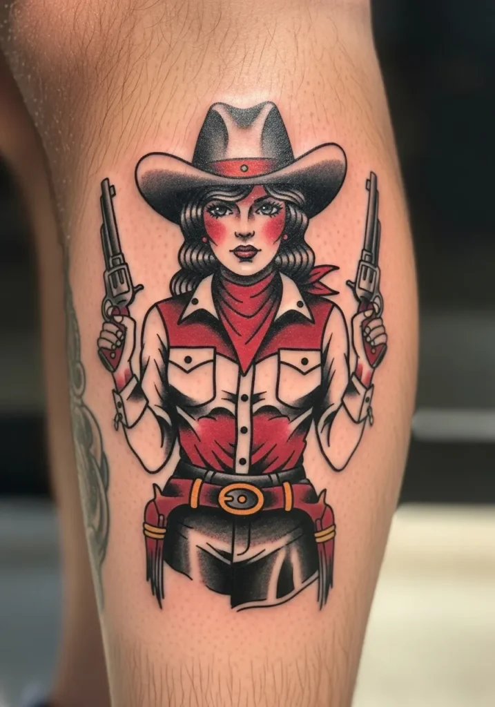 This leg tattoo shows a bold cowgirl with two pistols drawn, framed in strong black outlines and rich red shading. Her red scarf and matching vest add contrast to the creamy tones of her hat and shirt. The placement on the calf gives it a commanding presence while still being perfectly balanced.