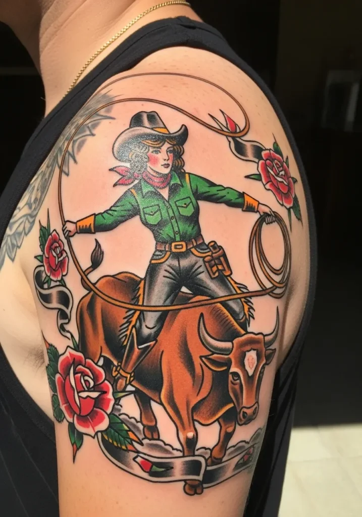 Holy smokes, this tattoo is full of action and personality! It s a large, dynamic piece fitting beautifully on the upper arm and shoulder, executed in the unmistakable American Traditional style. The centerpiece is a fierce cowgirl, dressed in a green shirt and brown pants, expertly riding a powerful bucking bull, complete with a lasso swirling around the frame. Bold red roses and flowing black ribbons accent the scene, adding a romantic yet daring touch. The rich colors deep green, earthy brown for the bull, and the strong red of the roses and bandana are outlined with heavy black, giving it that perfect vintage tattoo punch.