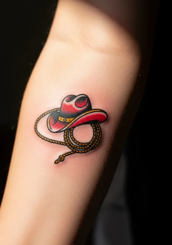 This small arm tattoo is as classic as it gets, showing a red cowgirl hat paired with a coiled rope. The design uses bold black lines and pops of golden yellow to highlight the details. Its compact size makes it perfect for the forearm or wrist, adding a subtle Western flair without taking over too much space.