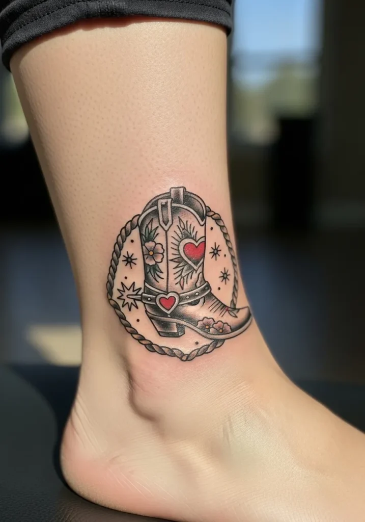 This small ankle tattoo keeps it simple and classic with a detailed cowboy boot inside a rope circle. The tiny hearts and flowers add a feminine touch, while the black shading gives it that timeless traditional look.