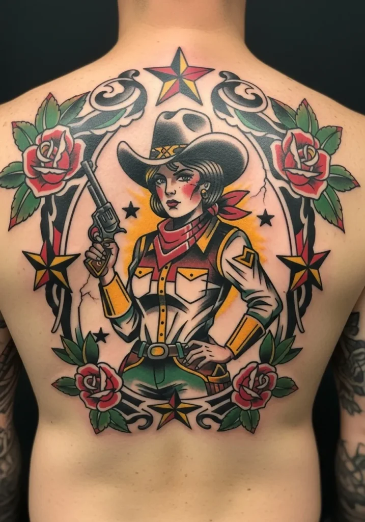 This full-back tattoo commands attention with a fierce cowgirl holding a revolver, surrounded by roses, stars, and scrollwork. The design s bright reds, greens, and yellows pop beautifully against the skin, and the central figure radiates strength and charm.