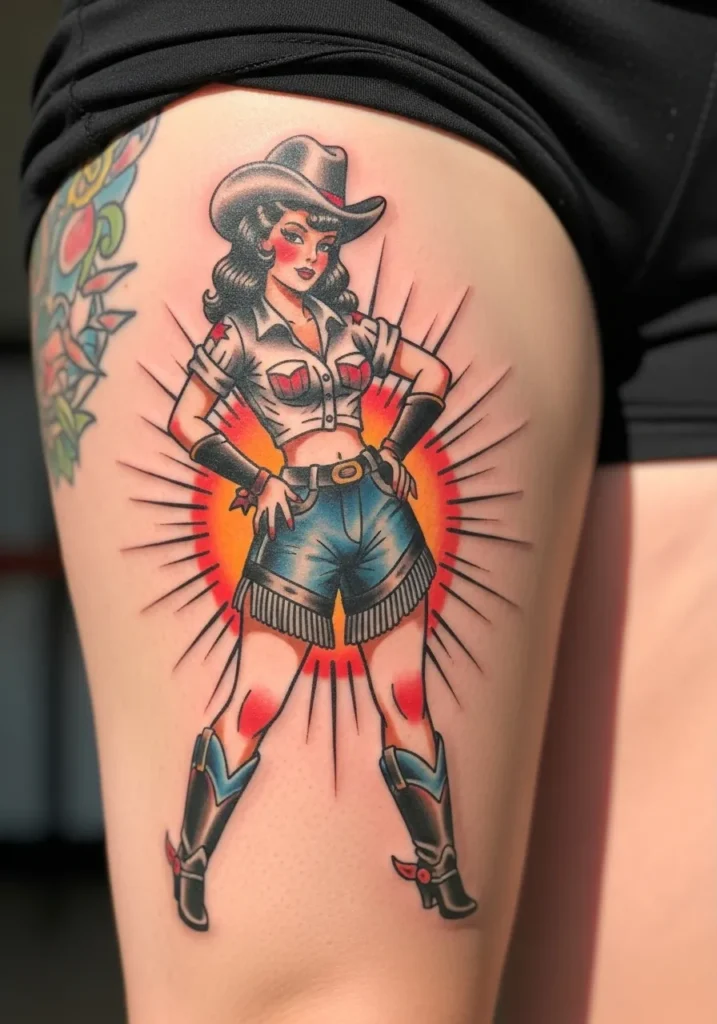 This thigh tattoo features a confident cowgirl striking a hands-on-hips pose in front of a radiant orange sunburst. Her rolled-up sleeves, high-waisted shorts, and cowgirl boots make her look straight out of a vintage pin-up calendar. The bold red and blue tones give it a lively, old-school punch.