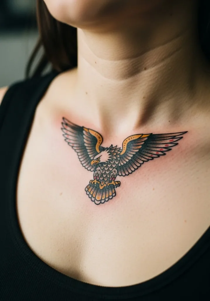 This delicate eagle tattoo sits right beneath the collarbones, spreading its wings gracefully across the chest. The golden accents and soft shading give it a refined, feminine edge while still keeping that classic old-school feel. It s the perfect size for someone who wants something meaningful but subtle.