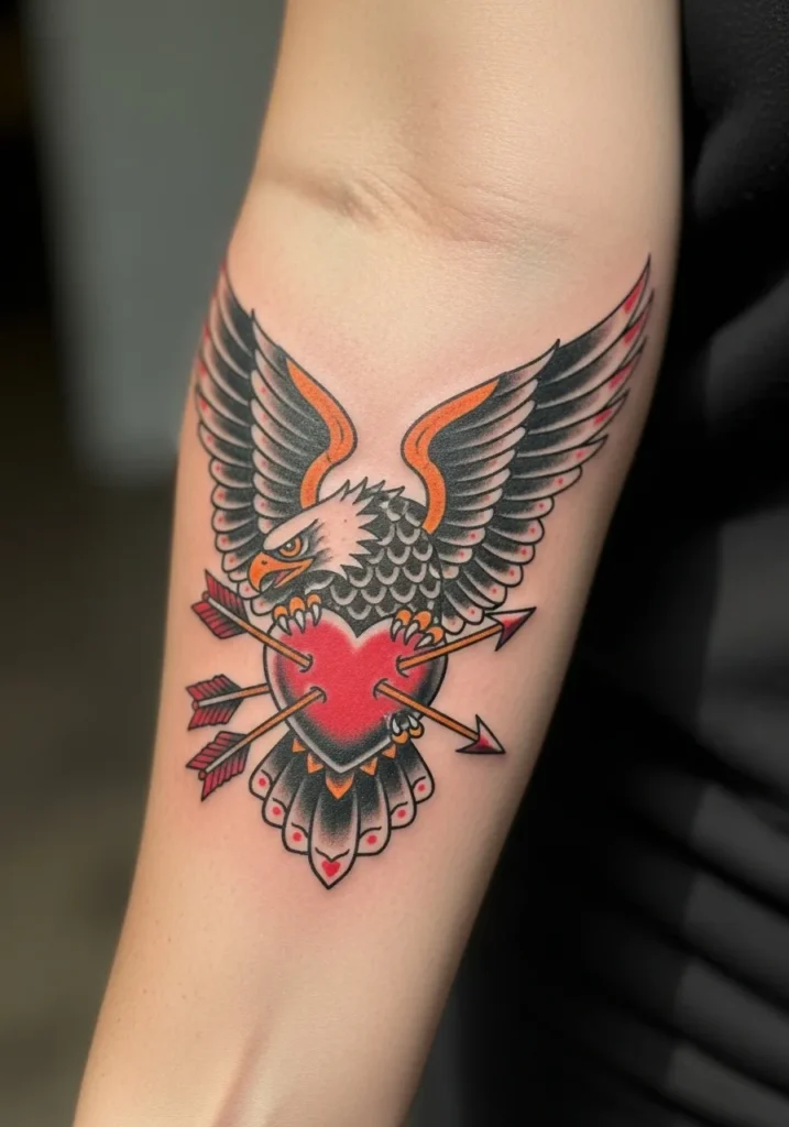 This bold forearm piece shows an eagle gripping a bright red heart pierced by arrows, surrounded by crisp black and orange detailing. The lines are thick and clean, while the composition feels perfectly balanced between fierce and romantic. It s a statement tattoo that fits beautifully on the arm.
