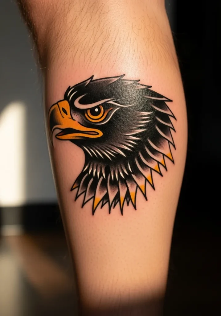 This tattoo focuses on the eagle s head, captured in that classic side profile with bold black shading and golden yellow highlights. It s compact yet fierce, perfectly placed on the calf where it stands out with every step. The detail around the feathers gives it that iconic vintage tattoo charm.