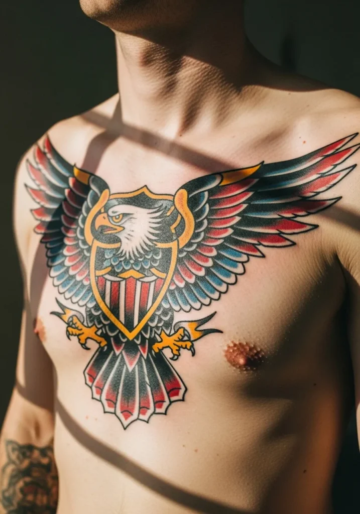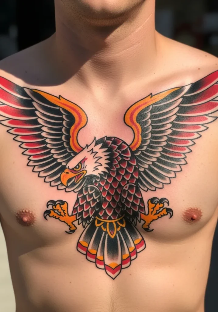 This chest tattoo spreads its wings proudly across the upper torso, featuring a fierce eagle in traditional American style. The design shows stunning symmetry with its bold outlines, rich black shading, and pops of red, blue, and gold that make the feathers come alive. Centered perfectly on the chest, it captures balance and confidence while staying true to classic tattoo artistry.