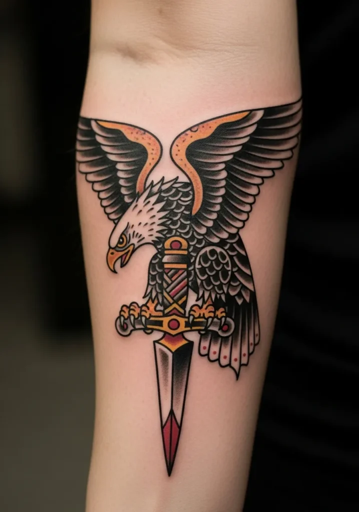 This traditional eagle tattoo spreads across the forearm, gripping a gleaming sword with its talons. The feathers are shaded in rich blacks and deep golds, while the sword features bright red details that make the whole design pop. The symmetry and clean lines give it that true old-school look that never goes out of style.