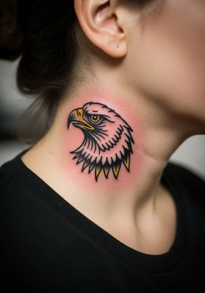 This small but mighty tattoo sits neatly on the side of the neck, showing just the eagle s head in classic American traditional style. The sharp lines, yellow beak, and clean black shading give it that unmistakable vintage look. It s simple, compact, and full of attitude.