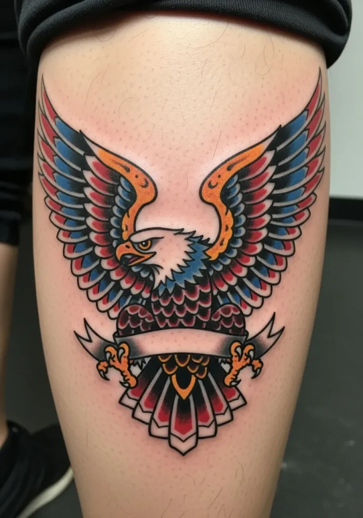 This traditional eagle tattoo sits proudly on the calf, wings spread in full display. The rich reds, blues, and oranges give it that authentic vintage tattoo look. The banner underneath adds a personal touch, ready for a name or a favorite word to make it even more meaningful. It s bold, bright, and perfectly balanced for the leg.