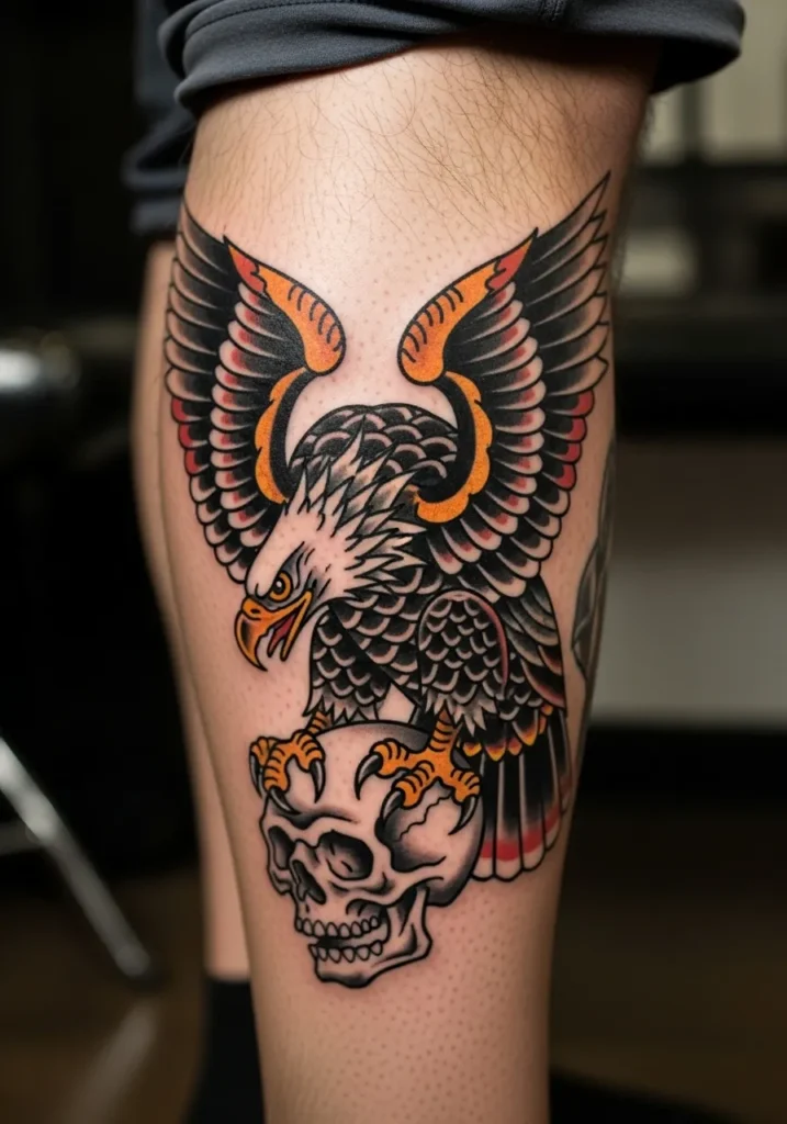 This leg tattoo pairs a fierce eagle with a skull beneath its claws a true symbol of dominance and fearlessness. The design is bursting with bold black lines, golden talons, and fiery red accents that give it a classic American traditional punch. It sits perfectly on the thigh, creating a dynamic look every time you move.