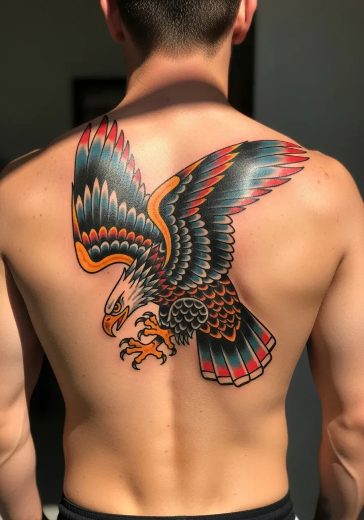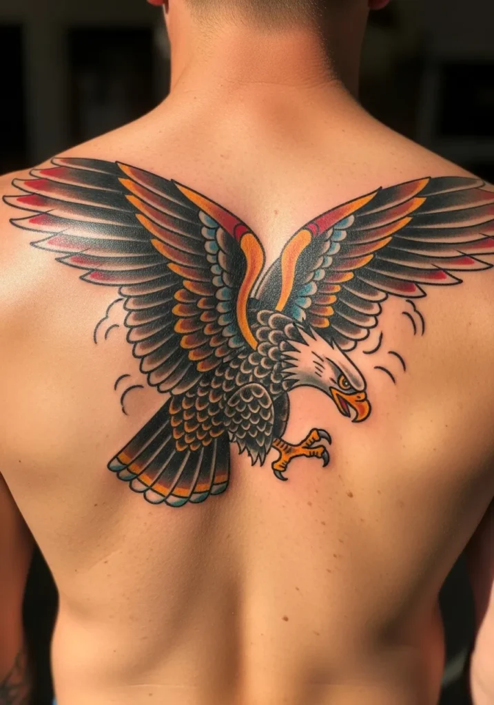 This breathtaking back piece shows a large American traditional eagle in mid-flight, wings spread wide across the shoulder blades. The color palette mixes bold blacks with fiery reds, oranges, and yellows, giving it that sunlit glow when the light hits. Every feather is perfectly defined, creating a sense of movement and power.