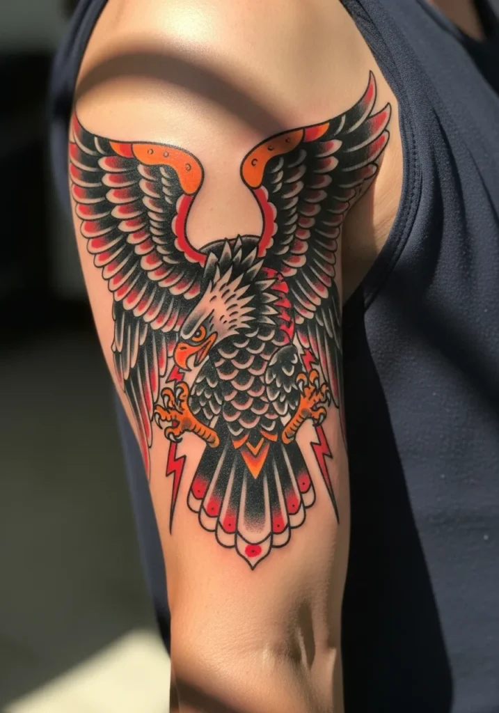 This powerful shoulder tattoo showcases an eagle with electrifying details and lightning bolts around its wings. The classic red, black, and orange palette gives it serious energy, and the way it hugs the curve of the arm makes it look perfectly placed. Every feather pops with bold shading and solid outlines that scream American traditional.