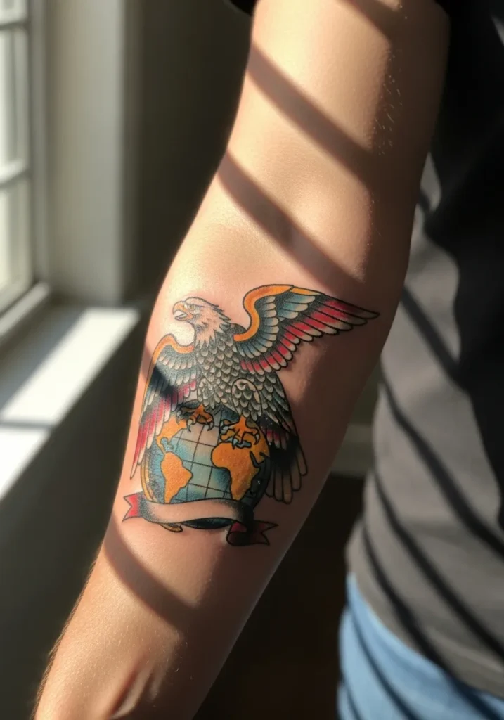 This arm tattoo features a majestic eagle perched over a globe, its wings spread in striking red, blue, and gold hues. The bold black outlines and classic shading bring the design to life, while the banner underneath leaves space for a personal touch. It s such a creative twist on the traditional eagle theme, blending global imagery with power and style.