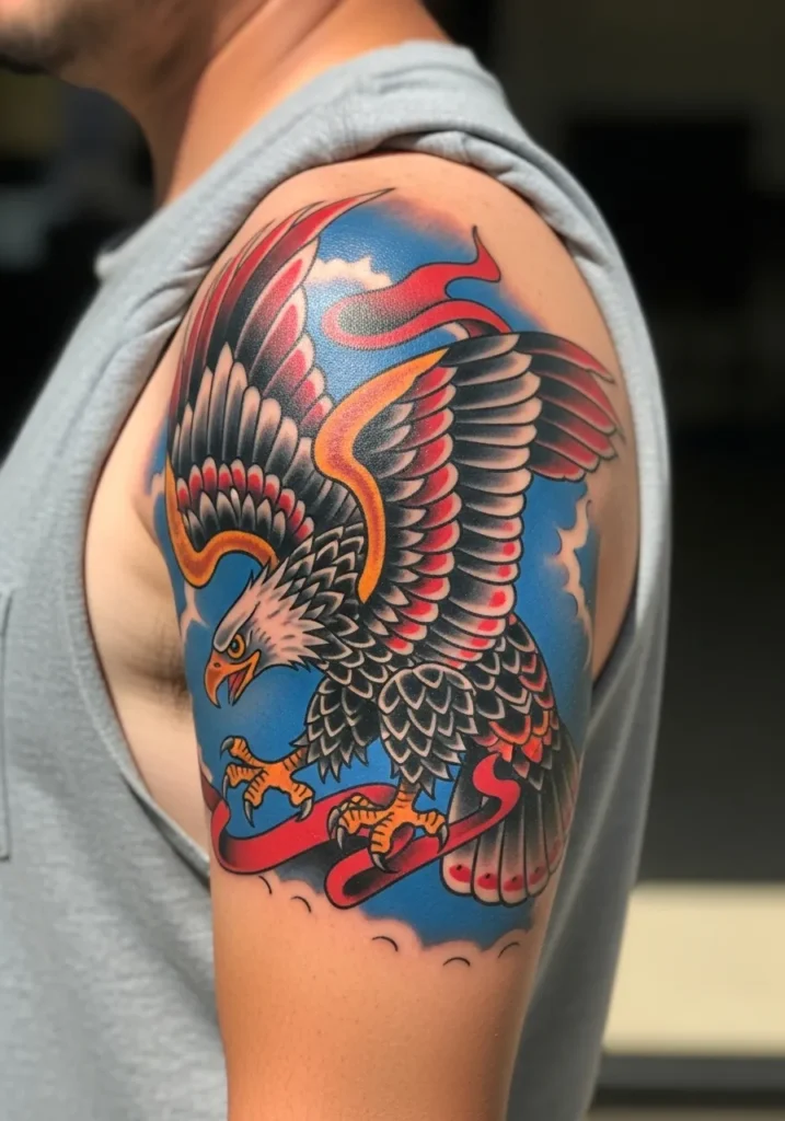This shoulder tattoo bursts with color and confidence, showing an eagle swooping down through blue skies and red ribbons. The composition fills the upper arm beautifully, using traditional black outlines and warm orange tones that make the feathers glow against the bright background.