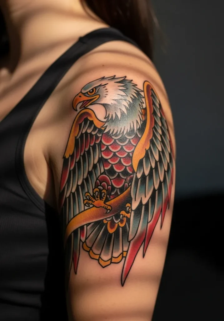 This shoulder tattoo showcases an American traditional eagle perched with pride, its feathers rendered in rich tones of red, black, and gold. The design curves perfectly with the shoulder, creating this gorgeous flow that looks both strong and elegant. Every feather seems meticulously shaded, showing off that old-school craftsmanship.