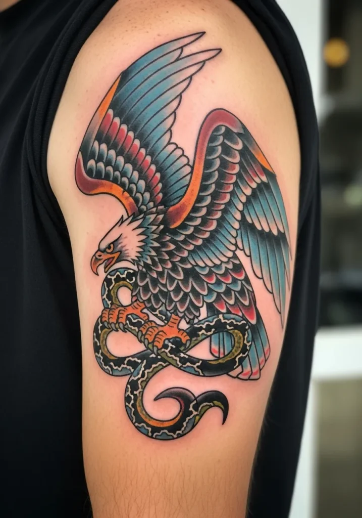 This bold upper arm tattoo shows an American traditional eagle locked in battle with a coiled snake. The design bursts with energy, featuring vivid shades of red, blue, orange, and black ink. The large wings are detailed with classic thick outlines and feather gradients that fade beautifully from dark to light. It s a medium-to-large piece that follows the arm s curve perfectly, giving it a powerful, dynamic look.