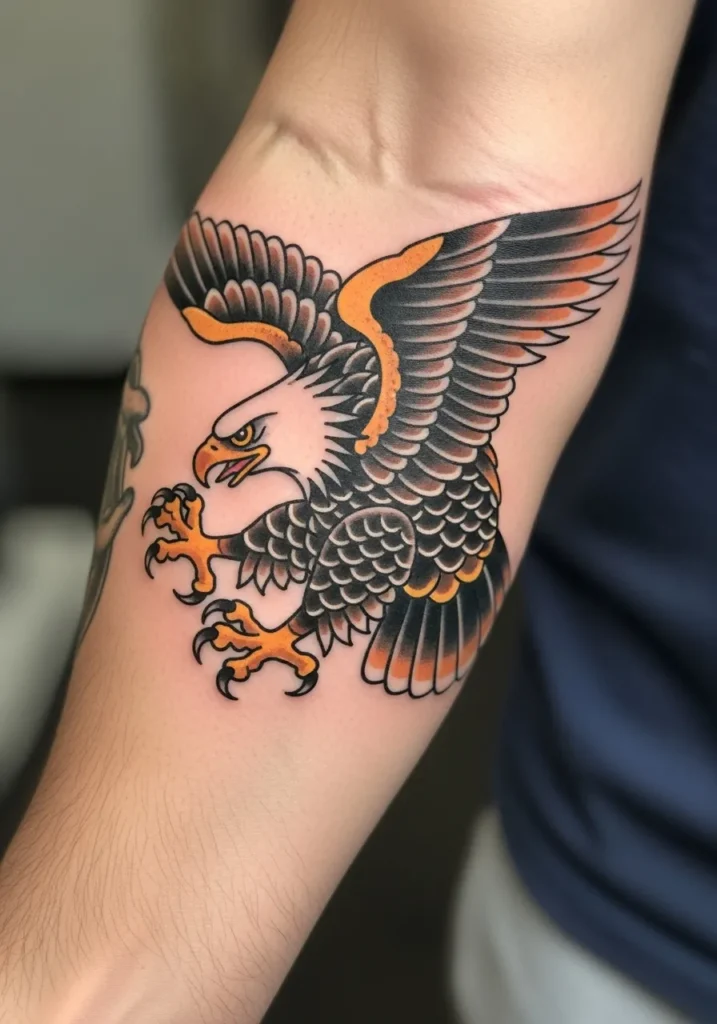 This forearm tattoo captures a bold eagle mid-dive, wings wide and talons ready to strike. The black and orange palette gives it that traditional edge, while the thick lines and crisp shading make it stand out beautifully against the skin. It s the kind of design that instantly commands attention, perfectly sized for an arm piece that wraps with movement.