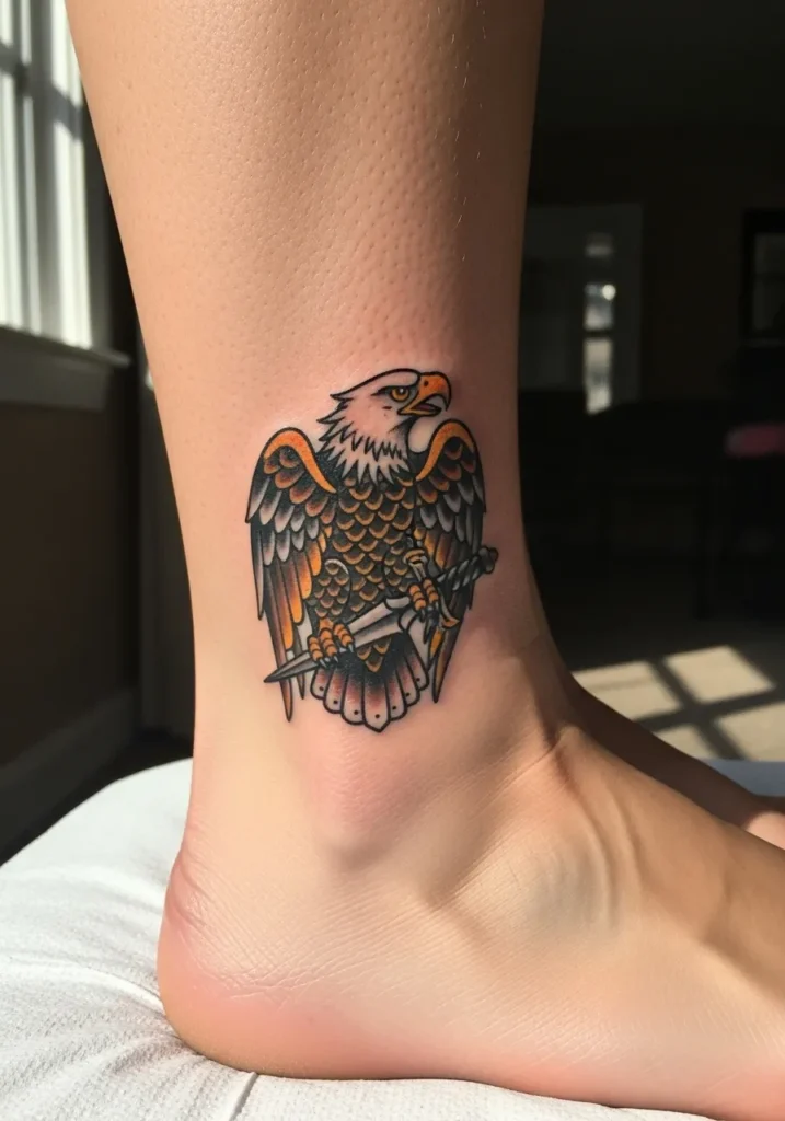 This ankle tattoo might be small, but it packs serious punch. The eagle clutches a sword, detailed in black, gold, and soft orange tones that pop against the skin. Its compact size makes it perfect for anyone who loves traditional art but wants something subtle and personal.