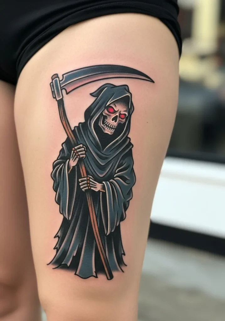 Bold Grim Reaper Thigh Tattoo
