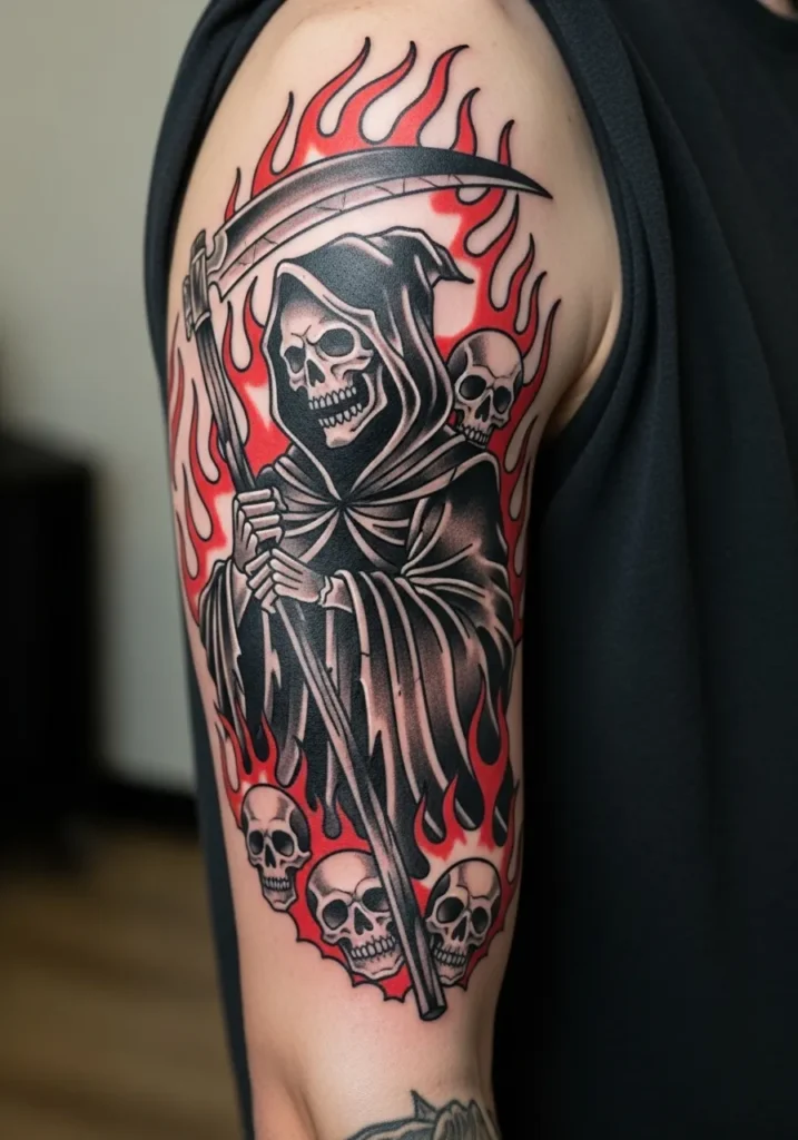 This upper arm tattoo is full of fire and attitude. The Grim Reaper stands surrounded by red flames and skulls, giving the design a dramatic punch. The black cloak contrasts perfectly with the vivid background, while the scythe slices through the composition with clean, bold lines.