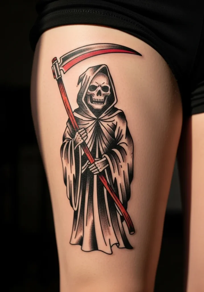 This thigh tattoo features a clean, classic Grim Reaper with a bright red scythe that instantly catches the eye. The long, flowing robe and balanced composition make it a flattering design that works perfectly with the thigh s shape. The simple black and gray shading gives it that timeless American traditional look.