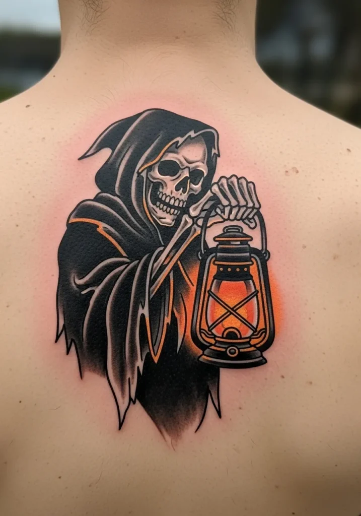 This striking back tattoo shows the Grim Reaper holding a glowing lantern, a fresh twist on the traditional design. The warm orange glow contrasts beautifully against the dark cloak, making the light feel almost real. The shading is smooth, and the placement in the center of the back gives it that perfect balance between bold and mysterious.