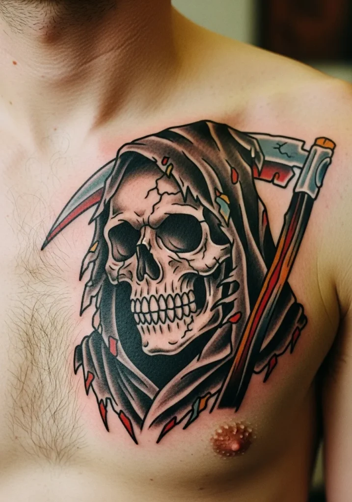 This large Grim Reaper chest tattoo is pure traditional perfection. The shading around the hood and skull gives it that cracked, worn look that screams vintage tattoo art. The reaper s menacing grin and weathered scythe sit boldly across the chest, showing off precise linework and deep black ink that s built to last. Splashes of muted red and yellow give it just enough warmth to balance the darkness.