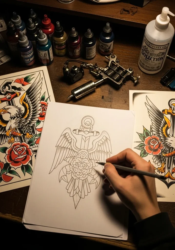 This photo captures the creative chaos of a tattoo artist s desk, complete with bottles of colorful ink, tattoo machines, and a hand sketching out a new flash design featuring an eagle, anchor, and rose. You can see the blend of precision and artistry in progress, where every line takes shape with intention.